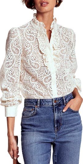 Elegance takes on a modern twist with this lacy button-up shirt made from a stretch-enhanced cotton blend that’s intricate and sheer.