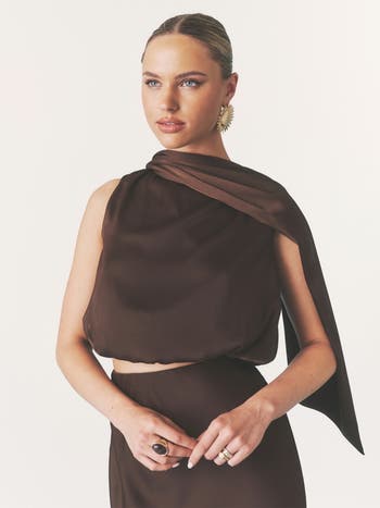 Elegant with a twist, the Solene top is crafted from soft-touch semi-matte satin. The high neckline drapes effortlessly, with a tie detail you can wear loose or styled as a chic neck scarf. The top is fully lined and has an elasticated hem to provide give. Pair with the matching maxi skirt for a full drama look.