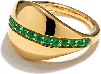 Verdant emeralds gleam from a sculptural ring crafted in 18-karat gold.