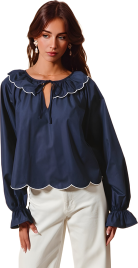 Navy blouse featuring white scallop trim, a ruffled stand collar, and self-tie neck bow. Slightly puffed sleeves and straight silhouette offer playful elegance for both tucked and untucked wear. Lightweight, crisp fabric with soft hand-feel mimics silk s drape. Adjustable neckline and gathered sleeves add tactile detail, while the color-contrast trim creates a polished finish.