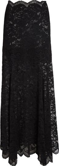 A gorgeous garden of romantic lace conceals and reveals to alluring effect across this scalloped maxi skirt, capturing the interplay between protection and exposure—a continued thread in Julien Dossena s designs.