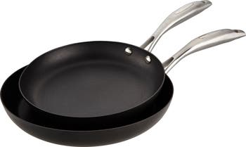 Sear, sauté and simmer with ease using these smartly engineered nonstick fry pans made from cast aluminum with a brushed steel handle. Scanpan s patented nonstick surface browns, braises, sears and deglazes food with gourmet results, ensures easy cleanup and is 10 times harder than steel. The recycled-aluminum construction with a steel disc cast in the bottom ensures even heat distribution and a consistent temperature during cooking, while also providing induction capability.