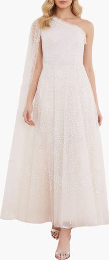 The Scatter Dot One-Shoulder Ankle Gown in Cream. This embellished gown is decorated with exquisite shimmering dot motifs, undulating in wave formations for a captivating glittering effect. This gown features a sweeping floor-length cape sleeve for romantic detailing and a statement look. The flattering one shoulder neckline is trimmed with signature Needle Thread tulle frills. The skirt is made up of generous layers of net and tulle with sweeping hemline.