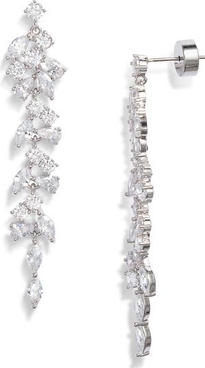 A stunning, scattered display of mixed-cut cubic zirconia cascades down the length of these statement-making earrings that flash in the light with every turn of your head.
