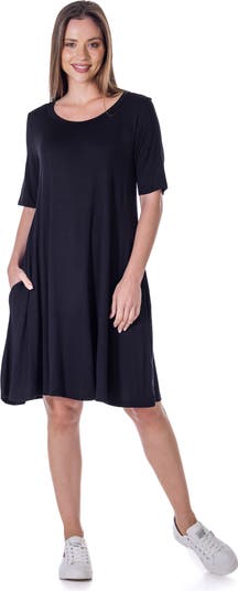 A perfect mix of style and practicality, this dress features elbow length sleeves, scoop neckline and pockets. Easy to layer with and style, the loose fit and soft flare hem make this the perfect figure flattering piece for all seasons. Made from a comfortable stretch material. Rayon Spandex Knit.