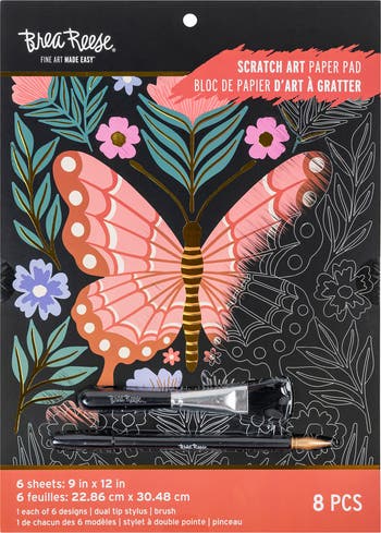 SCRATCH ART: PAPER PAD - BUTTERFLY GARDEN - Immerse yourself in the beauty of nature with the Brea Reese Scratch Art Paper Pad - Butterfly Garden. Scratch and Display! Follow the outlines to reveal the art beneath. Scratch as much or as little as you like! Featuring 6 enchanting designs, this guided kit allows you to reveal delicate butterflies and vibrant florals with every scratch. Bursts of color and metallics bring these garden scenes to life, creating art that radiates elegance and tranquility. With a dual-tip stylus and brush included, this kit makes it easy to craft each detail with precision. The perforated pages are designed for effortless removal, so you can frame your finished artwork to brighten up any room. Craft kit INCLUDES 6 Design Sheets (9" x 12"), 1 Brush, and 1 Dual-Tip Stylus.