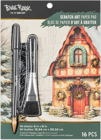 BREA REESE: SCRATCH ART: PAPER PAD - HOME FOR THE HOLIDAYS - Celebrate the warmth and coziness of winter with the Brea Reese Home for the Holidays Scratch Art Paper Pad. Featuring 14 pages of stunning winter landscapes (2 copies of 7 different designs), this pad is the perfect DIY holiday decor project. Scratch away the top layer to reveal vibrant, festive colors that capture the spirit of the season. Each page is perforated for easy tear-out, making it simple to frame and display your beautiful creations. Pops of metallic and color add a festive holiday touch. Ideal for all skill levels, from beginners to experienced artists. Perfect for on-the-go crafting, making it fun and portable for holiday trips. Art Kit INCLUDES 14 sheets (6" x 8"), 1 dual tip stylus, and 1 brush.