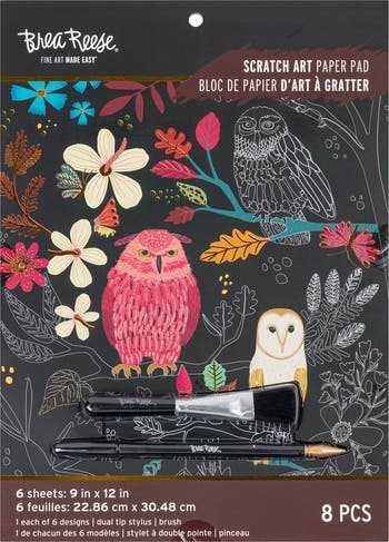 SCRATCH ART: PAPER PAD - OWL MOON - Explore the mystery of the night with the Brea Reese Scratch Art Paper Pad - Owl Moon. Scratch and Display! Follow the outlines to reveal the art beneath. Scratch as much or as little as you like! This guided art kit includes 6 detailed illustrations of owls soaring through the moonlit sky. Scratch away the surface to reveal glowing metallics and rich colors that make each nocturnal scene come alive. Equipped with a dual-tip stylus and brush, this kit offers the tools you need for precise crafting. The perforated pages are easy to tear out, allowing you to frame your finished artwork for a mystical addition to your décor. Craft kit INCLUDES 6 Design Sheets (9" x 12"), 1 Brush, and 1 Dual-Tip Stylus.
