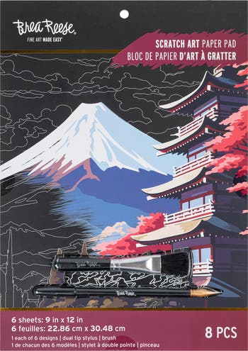 SCRATCH ART: PAPER PAD - GLOBAL ICONIC VIEWS - Capture the essence of the world s most iconic landmarks with the Brea Reese Scratch Art Paper Pad - Global Iconic Views. Scratch and Display! Follow the outlines to reveal the art beneath. Scratch as much or as little as you like! This scratch art kit features six breathtaking designs, including stunning depictions of Mount Fuji, the Colosseum, Edinburgh Castle, and more. As you scratch away the top layer, vibrant colors and metallic accents bring these majestic scenes to life. With its dual-tip stylus and brush, the kit makes it easy to reveal each intricate detail. Once complete, these frame-ready masterpieces will add an elegant, travel-inspired touch to your home décor. Craft kit INCLUDES 6 Design Sheets (9" x 12"), 1 Brush, and 1 Dual-Tip Stylus.