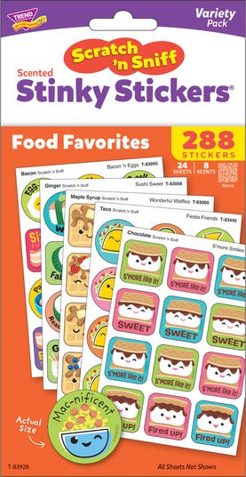 SCRATCH N SNIFF: FOOD FAVORITES - 288CT STINKY STICKERS - Discover foods from around the world, with on-trend colors and cuteness! Encouraging, engaging, irresistibly collectible Stinky Stickers designs are e-SCENT-ial motivators and rewards. Scratch n sniff aroma plus fresh, friendly artwork appeals to kids and the kid in all of us. Great for icebreakers and creative storytelling starters. Great for crafts and correspondence, in the classroom, home, or workplace. Variety and novelty of themed designs, messages, and scents helps maintain attention and promote desired responses among your audience (whether children or grown-ups!). Acid free, nontoxic, and safe for use on photos, making them a perfect choice for scrapbooks, classroom projects, and creative fun at home. Everyone’s favorite for decades, Stinky Stickers are fun to collect or use to motivate and reward. TREND: We make learning fun! OVERVIEW: 24 sheets per package, 8 food-themed scents, 288 stickers per pack. Each sticker 1.25" diameter. Photo safe, acid free for journaling, allergen free, and made in the USA.