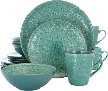 Freshen up your table setting with the trextured Sea Foam Mozaic 16 Piece Dinnerware Set by Elama. With a calming tone of Sea Green and textured mandala style designed plates, this set is ready to make a statement at your next gathering. Stoneware construction of each dish is ideal for special occasions and durable for every day use. Each piece is microwave safe for quick reheating and dishwasher safe for easy cleaning.