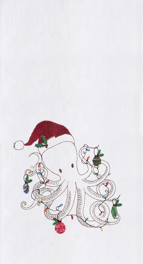 Make holiday moments shine with the Sea Life Octopus Flour Sack Kitchen Towel. The merry octopus is ready to be your jolliest kitchen buddy, with its tentacles holding up festive string lights, sporting a Santa hat and adorned with ornaments. Stay with and accompany us during our continued home décor magical ventures every season years after years.