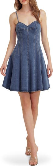 Bring a little edge to your sweet side with this denim minidress. The fit-and-flare silhouette and just-right stretch make it perfect for twirling, dancing or simply turning heads.
