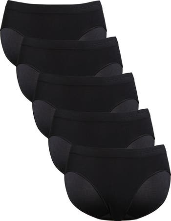 The Seamless Modal Blend Bikini 5-Pack features breathable, stretchy fabric that feels light and smooth on the skin. Its seamless waistband provides a no-show fit and moderate coverage for everyday comfort and durability.