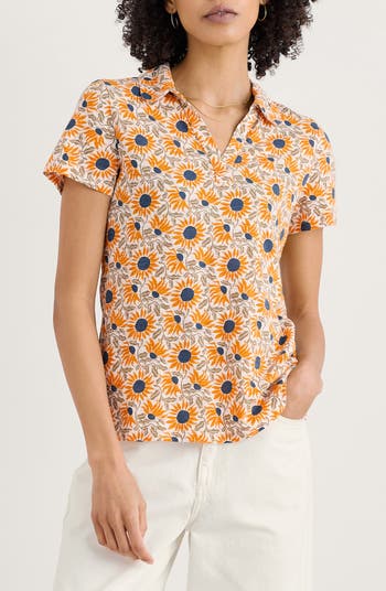 Brighten your day with the cheery sunflowers blooming across the soft organic cotton of this knit top finished with a spread collar that brings a bit of polish to its cool jersey comfort.