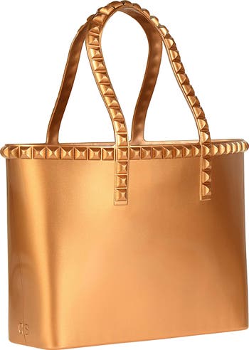 This jelly handbag is perfect for both a night out as well as the beach. The rubber studded tote can be customized in both color and favorite charms. Choose from 15 different colors and charms that express your favorite cities, favorite words, and other forms of self-expression Shop this and other jelly bags and studded handbags.