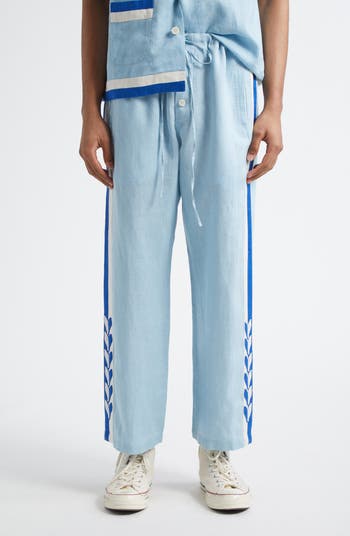 Channeling the nostalgic whimsy of a midcentury dish towel, these breezy linen pants boast bold side stripes and playful leaf appliqués near the hem and at the back.