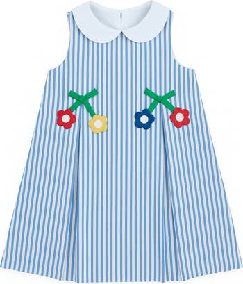 Light and classic, this royal and white stripe seersucker dress is crafted from soft 100% cotton for breezy comfort. A crisp white finewale pique collar adds a polished finish, while delicate spaghetti ties with loose flower appliqués lend a playful, handmade touch. Inverted pleats create gentle fullness for easy movement, and a back zipper ensures simple dressing. Designed to fall at the knee, it’s perfect for warm-weather outings, vacations, and spring celebrations. A fresh, cheerful style made for sunshine, smiles, and seaside adventures.