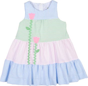 Light and joyful, this dress is crafted from pastel pink, blue, and green stripe seersucker for a breezy, warm-weather feel. Appliqué tulips bloom across the bodice with green ric rac stems, adding playful color and charming detail.\nThe tiered, shirred skirt creates soft movement, while a back neck button closure keeps dressing easy and polished. Designed to fall above the knee, it’s perfect for sunny vacations, spring celebrations, and picture-perfect days outdoors.