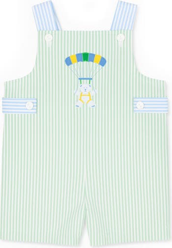 Playful and perfectly suited for warm-weather adventures, this shortall is crafted from pastel green and white stripe seersucker with coordinating pastel blue and white stripe trim. A charming appliqué bear floating down by parachute adds a touch of whimsy that feels right at home on vacation days.\nAdjustable shoulder straps with double buttons and side waist tab buttons ensure a comfortable, flexible fit, while inseam snaps make changes quick and easy. Lightweight and breathable, it’s ideal for sunny outings, travel days, and picture-perfect moments away.