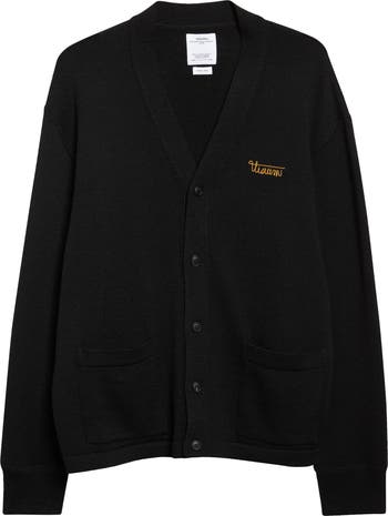 The future vintage aesthetic that defines Hiroki Nakamura’s designs takes center stage in this wool V-neck cardigan that’s made to last.