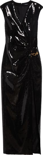 Glossy sequins shine on this side-draped dress secured with a golden chain detail above the leg-revealing slit. Strong padded shoulders provide structure to this elegant plunge-neck style.