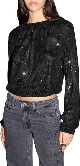 Built for the dance floor and the afters, this sequin-covered top shines hard while the gathers at the neckline and billowy sleeves keep the look light and lively.