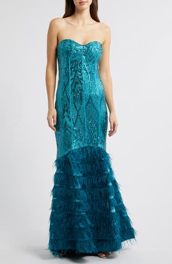 Lustrous sequins illustrate the satin-trim corset-inspired bodice of this svelte strapless gown that s perfected by a voluminous mermaid skirt.