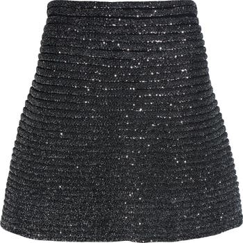 Part of the resort 26 collection, this gunmetal skater skirt is horizontally ribbed and knit from glossy bouclé yarn flecked with dazzling sequins.