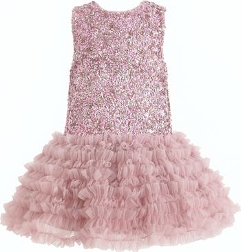 Make her moment sparkle in this dazzling pink dress, designed for birthdays, weddings, and all things twirl-worthy. The bodice glistens with multi-tonal sequins, while the voluminous tulle skirt adds a dreamy finish. Fully sequined bodice in shimmering shades of pink for standout sparkle. Layered tulle skirt with soft ruffles for extra bounce and elegance.