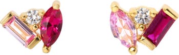 Make a bold statement with the Seraphina Ruby and Pink Sapphire Celeste Stud Earrings. These exquisite earrings feature a vibrant ruby centerpiece, complemented by delicate pink and clear stones, all set in luxurious gold plating.