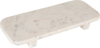 - A pristine white marble serving board elevated on sleek feet, marrying sophistication with practical design