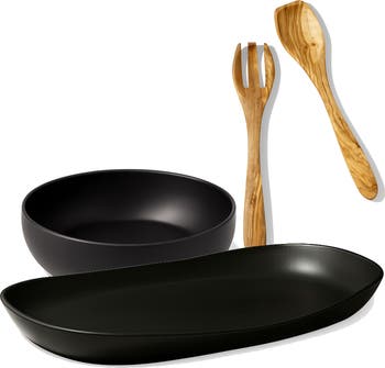 Elevate your table setting with our elegant Serving Platter and Bowl Set, now complete with an olive wood serving set for an added touch of rustic charm. Designed for effortless entertaining and family-style meals, this set includes our medium serving platter, a matching bowl, and an olive wood serving set—perfect for enhancing your presentation. Crafted with a sleek, minimalist design, these pieces complement any dining experience. Ideal for serving everything from salads and pasta to appetizers and main courses, this versatile set is a beautiful addition to your serveware collection, combining style, durability, and easy cleanup. Dimensions: Serving Platter: Length: 15", Width: 9.8", Height: 1.8", Weight: 4.5 lbs Serving Bowl: Diameter: 9.4", Height: 3", Weight: 3.5 lbs Olive Wood Serving Set: 11.8" Specifications: Food safe Microwave and dishwasher safe Oven use: because stoneware is a fragile material, we advise extra caution as we offer no guarantee. Check out our Use Care Handmade Material: Enameled stoneware Completely free of toxic heavy metals (like cadmium and lead) and carcinogens found in other, less robust, ceramic forms. Made in Tunisia Disclaimer: Our products are handmade by ceramists, one at the time. As such, they re all unique in their own ways and you may spot a small finger print on the base, or the imprint of the grid onto which they were placed when fired. Please note that these are the marks of true craftsmanship.