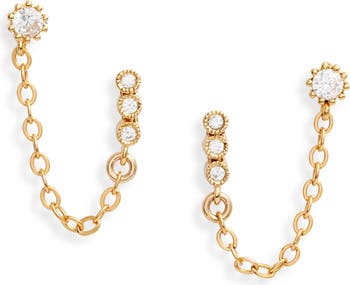 Bezel-set cubic zirconia highlight dainty chains on these double-stud vermeil earrings that bedeck multiple piercings on each lobe.