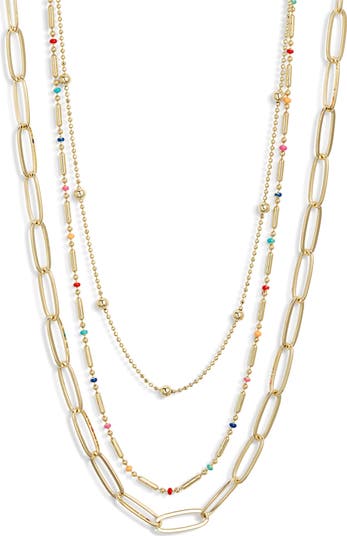 Love to layer with this set of necklaces including a dainty ball station chain, enamel-dotted chain and paper-clip chain finished in warm 14-karat gold.