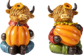 The set of 2 Fall Resin Highland Cow Table Decors are a charming and whimsical addition to your autumnal decor, featuring two delightful resin highland cows, each adorned with a vibrant sunflower on their head and a pumpkin in their lap.