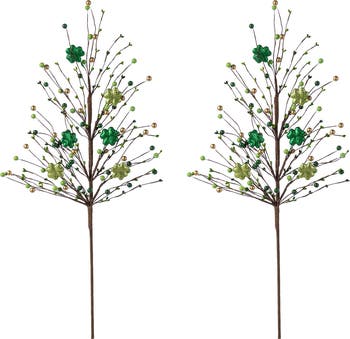This Set of 2 28"H St. Patrick s Picks features slender brown branches. They are decorated with green shamrocks, gold beads, and small green berries, adding a festive St. Patrick’s Day charm to floral arrangements or home decor.