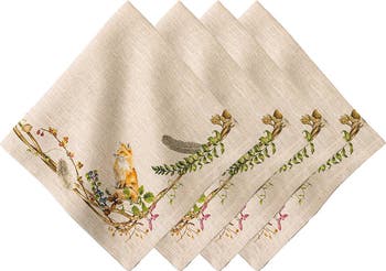 Celebrating the bounty of friends and abundant fare at harvest time, a stately stag, regal pheasant, thoughtful fox and charming squirrel are featured on the corners of beautifully woven linen napkins bordered in a painterly autumnal motif.