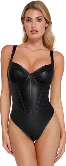 - Transform your silhouette with the Faux Leather Hourglass Corset Bodysuit—edgy, sculpting, and designed to define your curves.