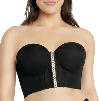 Our new Shea Longline Strapless Bra has the smooth qualities of shea butter and the slip-proof support of a full bustier. Designed with silicone elastic at the neckline, full back with multiple hook eye closure, and non-slip gripper fabric on the back, this strapless bra provides the ultimate support. Shea’s seamless smooth cups are accented by decorative, modern lacing in the center making this an eye-catching, trendy wardrobe staple.