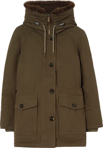 A parka in cotton nylon gabardine, washed for a soft finish and padded with goose down and feathers. Part of our Gabardine Capsule, the design pays homage to the house’s iconic signature – a revolutionary fabric invented by Thomas Burberry, worn by explorers and everyday adventurers alike. Inside the coat is lined with the Burberry Check and features a specially designed label inspired by an archival campaign. Cut to a regular fit, the style is finished with a detachable shearling trim at the hood and an embroidered Equestrian Knight Design.||Button and two-way zip closure|Drawcord hood and waist|Side zip and button flap pockets|Velcro-tab cuffs|Rib-knit storm cuffs|Embroidered Equestrian Knight Design at sleeve|Burberry Check lining|Comes with a garment bag