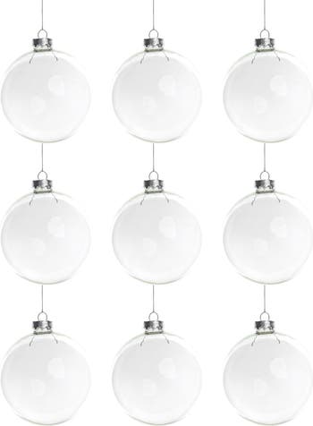 Ravish your home this Christmas with our new clear ball ornaments! Specially crafted with you in our minds and your home in our hearts, these balls are a pure joy to the soul. They come with a silver cap and clear sides to offer you a vast decorative canvas of new creative possibilities! Product Features: 9-piece set Color: clear Finish: shiny Balls are equipped with silver ornament caps (ornament hooks are not included) Ornaments come ready-to-hang on silver cords Caps can be removed and ornaments can be filled with sand or tiny items Recommended for indoor decorative use only Dimensions: 2.5" (65mm) Cap opening: 0.37" diameter Material(s): glass/metal Note: These ornaments are only able to be filled from the top; they do not come apart