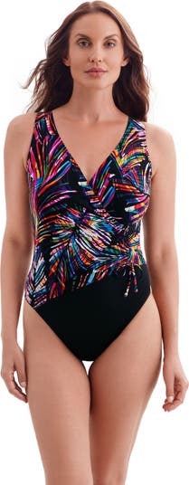 A little twist, a little shirring, and a whole lot of style. This endlessly flattering surplice one-piece features a faux tie detail that cinches your waist just right, paired with a modern leg cut for a fresh, bold look. In vibrant multi-color prints, it makes every swim feel like a getaway — just add sunshine.
