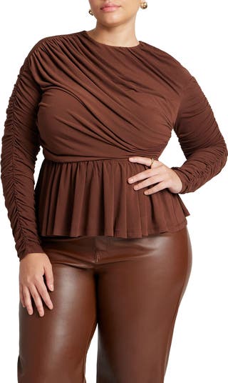 A peplum knit top with artful shirring and a graceful, high-hip finish.