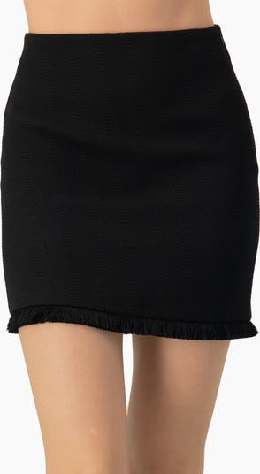 - Elegant black short skirt with fringe detail featuring a convenient zipper closure.