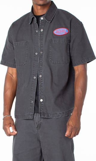 Serve streetwear casual in a snap-front short sleeve canvas shirt that features a bold contrasting back patch. Match back to its coordinating baggy straight pant for a one-and-done look.