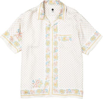 A shirt crafted from silk scarves, showcasing intricate artisanal techniques. The silk fabric is minimally twisted and woven on a shuttle loom to maintain its delicate quality and finish, with a expertly printed pattern. The edges of the front, hem, cuffs, and pocket are finished with a hand-rolled hem, a skill mastered by only a few artisans in Japan.