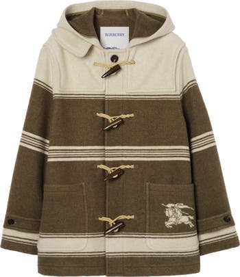 The Harrogate duffle coat is made from a wool cotton blend, woven with contrasting stripes and our Equestrian Knight Design. The hooded style is cut to a relaxed fit and features logo-engraved toggles in the shape of our B shield.||Button and toggle closure|Throat latch|Side patch pockets|Button-tab cuffs|Comes with a garment bag