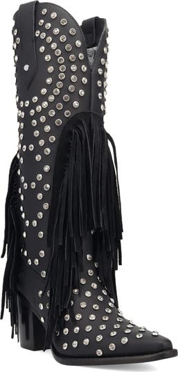 Complete your look with the unmistakable glamour of this iconic Western boot embellished with sparkling crystals and dramatic fringe trim.