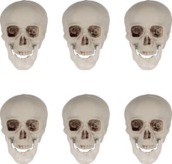 Create an eerie atmosphere this Halloween with this pack of six mini skeleton skulls Halloween decorations—a spooky essential for haunted houses, yard scenes, and party setups. Each skull is crafted with realistic details, from sunken eyes to textured bone-like surfaces, giving them a creepy, lifelike appearance that captures attention. The articulated jaws allow you to position each skull with mouths open or closed, adding variety and personality to your Halloween scene. These lightweight yet durable skulls are ideal for both indoor and outdoor use. Scatter them across a table for a macabre centerpiece, place them on shelves for an unsettling effect, or position them in your yard among tombstones and spider webs for the ultimate fright night. Their versatile size and adjustability make them a great fit for DIY projects, whether you re building a skeleton prop or creating a horror-themed photo booth. This six-piece set comes conveniently packed in a black mesh bag for easy transport, quick cleanup, and compact storage until next season. Perfect for Halloween enthusiasts, party planners, or anyone aiming to up the scare factor, these decorative skeleton skulls deliver creepy charm and bone-chilling style with minimal effort. A must-have addition to your Halloween décor collection. Features: Set of 6 skull mini Halloween decorations Hinged jaws that can be opened or closed Securely packaged in a black mesh bag For both indoor and outdoor use Each skull measures: 4.5"H x 3.5"W x 4"D Material(s): plastic